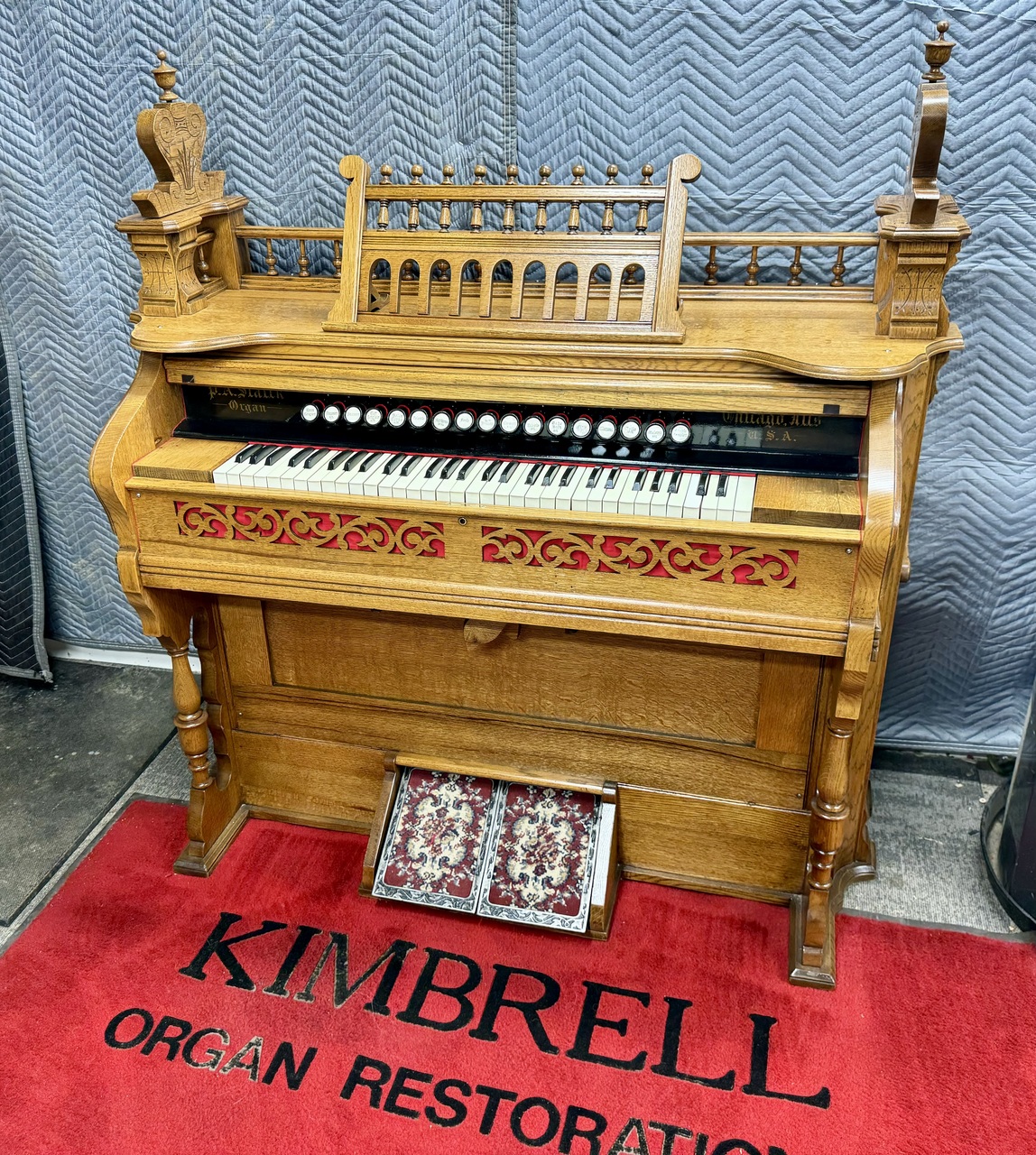 PA Starck (prob. Made by Estey). 4/28/1913 written on keyboard frame front beneath keys. A435 pitch. Four sets of 61 reeds each and a 13 reed sub bass.