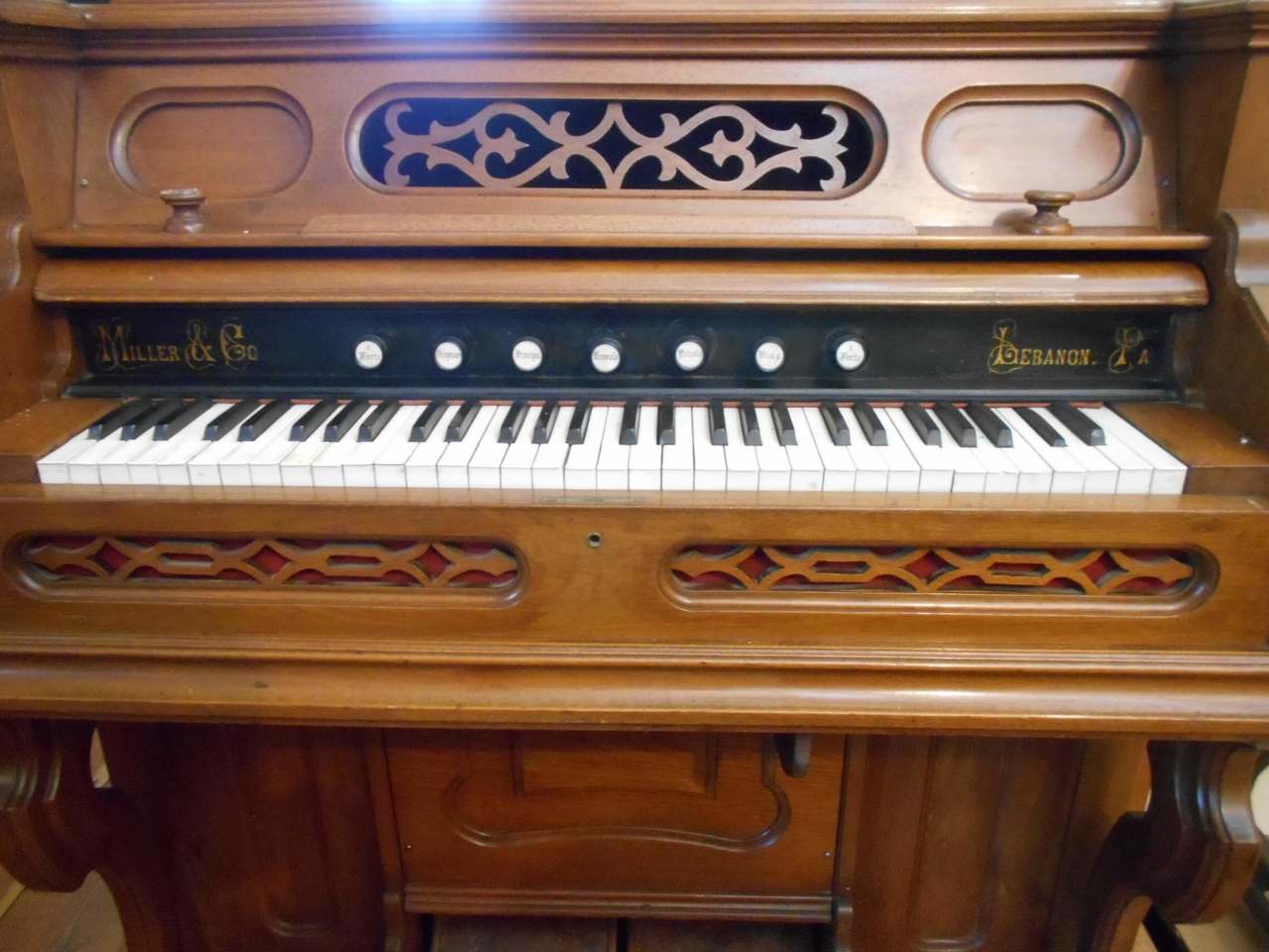 The number 485 is stamped into the wood in three places: the keyboard cover, the hinged top lid panel and the top-plank to which the top-lid panel is hinged. The tremolo box has a paper which reads "Parker's Free valve tremolo" and "G W Ingalls & Co, Worcester Mass". My mother was an Ingalls. The name arrived at Salem in 1628, with two brothers from England. The tremolo paper is the only paper in the organ. If it had a Miller paper I see no traces of it.