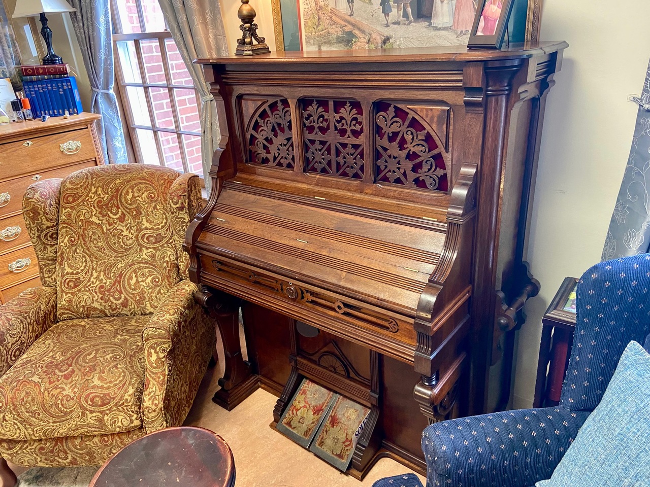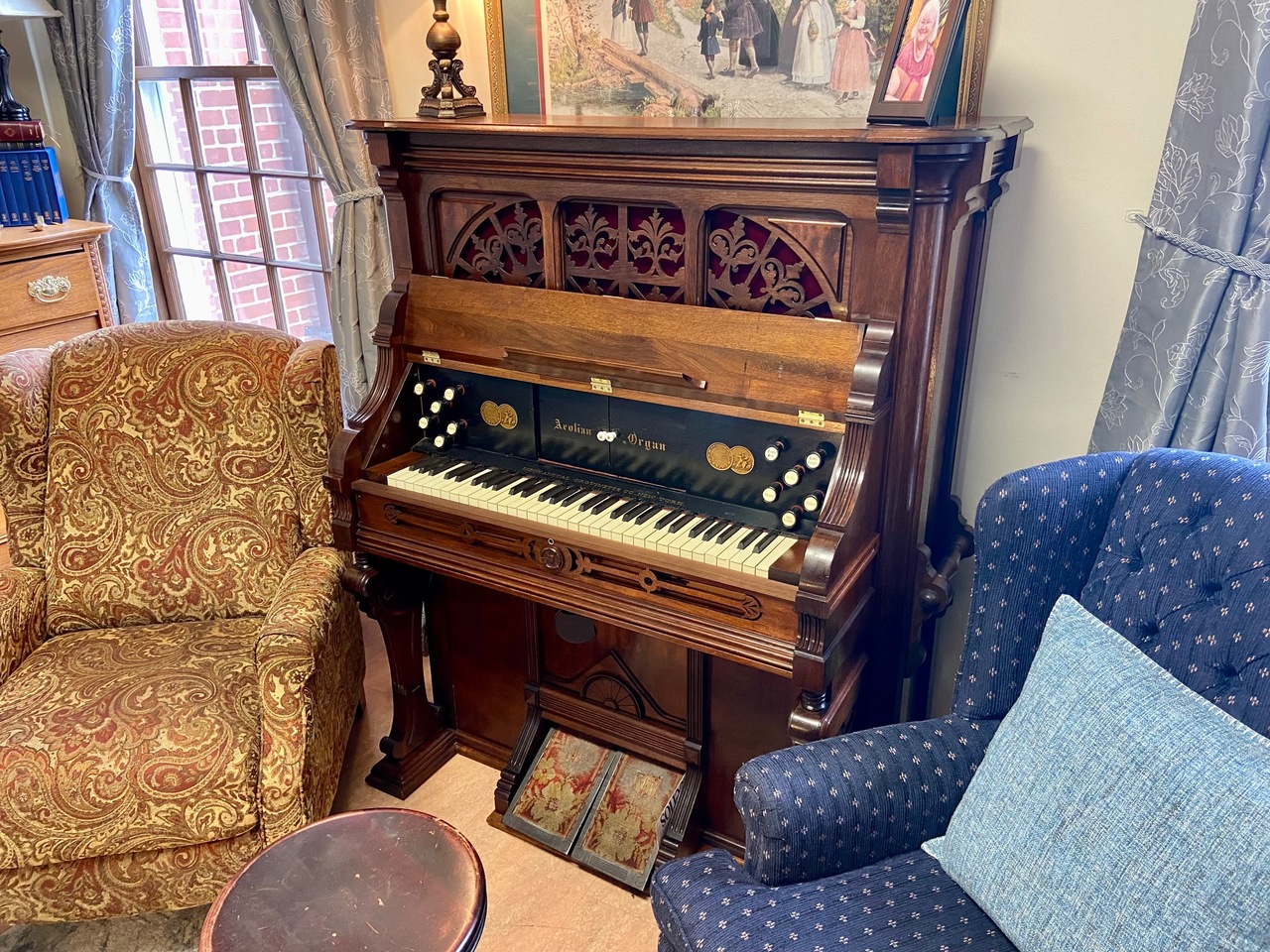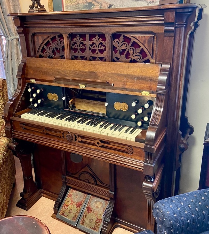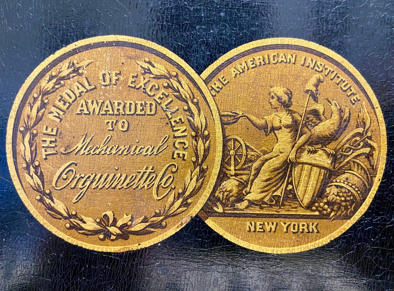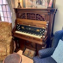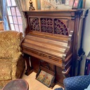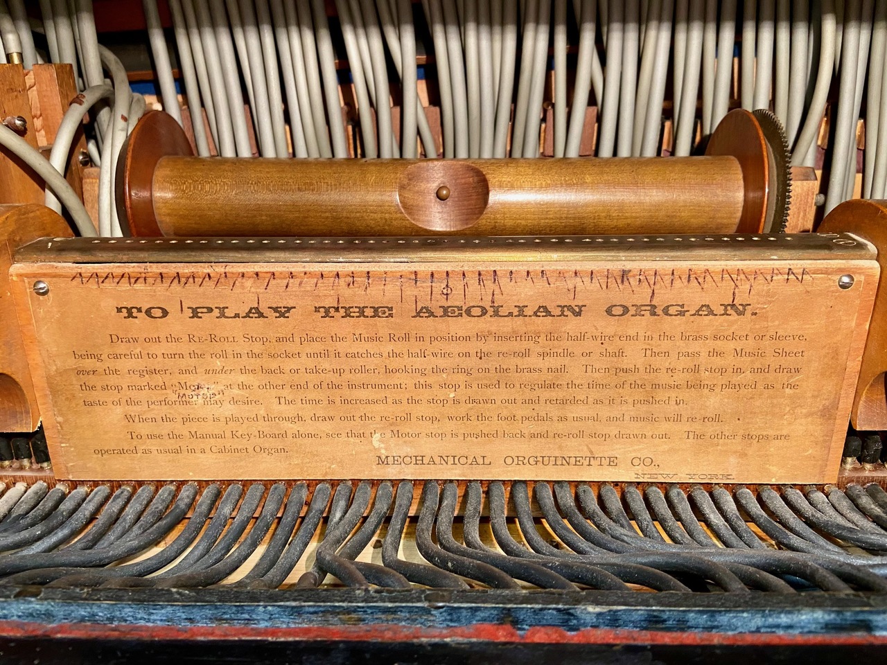 Aeolian player organ, Mechanical Orguinette. The 1050 model was essentially two separate actions in one. The action operated by the rollplayer was placed vertically along the back, and the action operated by the keyboard was a regular one horizontally placed under the keyboard itself. On this one the player portion is not currently functioning.