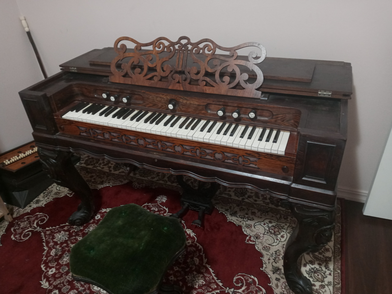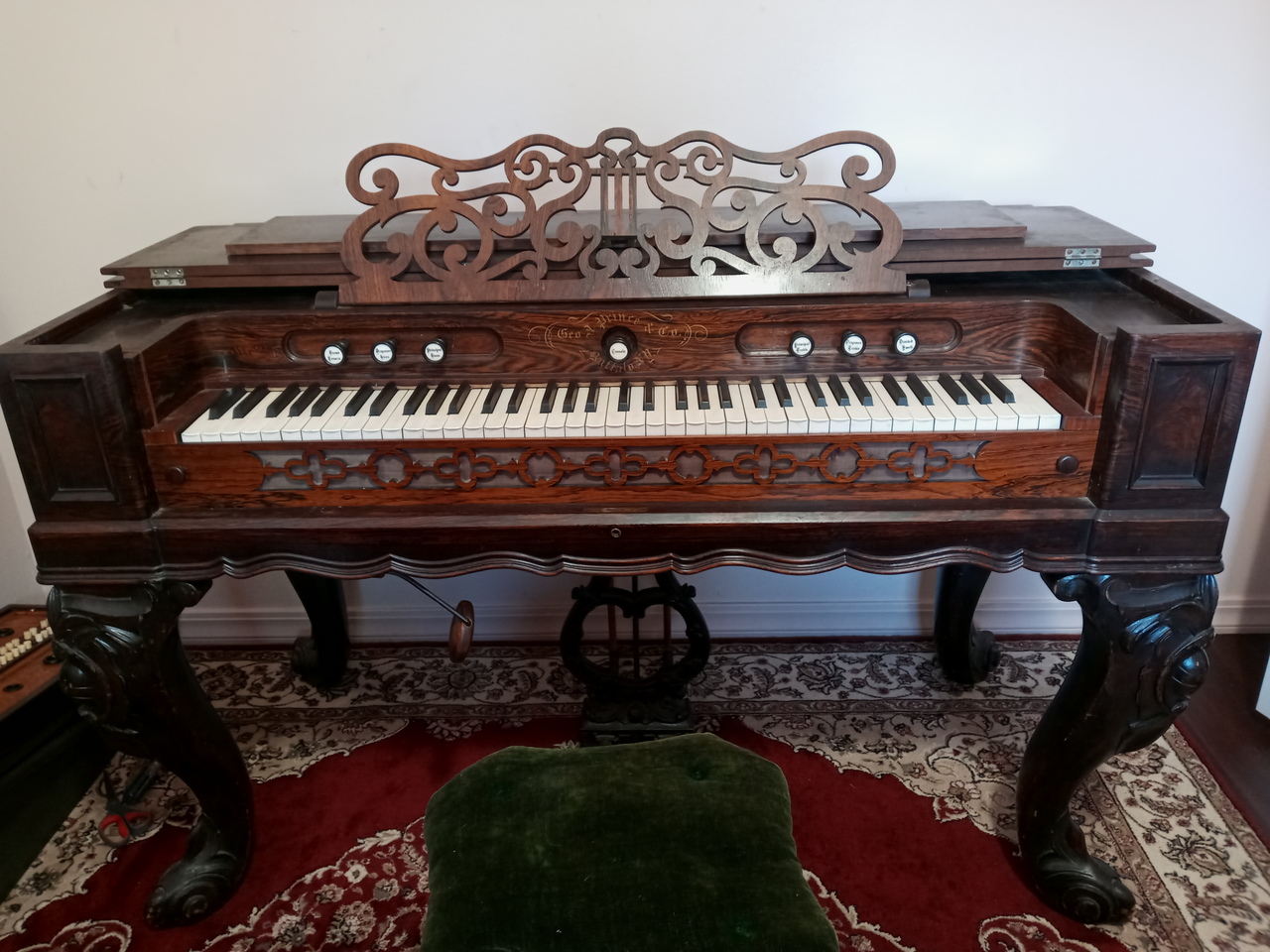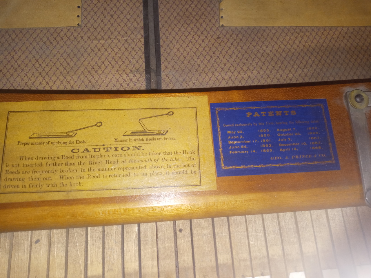 A very rare and exceptionally well-preserved example of a Prince melodeon. Everything is original, and everything is there. It has the original bellows which still hold air after 150+ years. Has passed owners 4 times in the past 2 years and little is known about its provenance. Plays very nicely and has two sets of reeds, an 8' and 4' rank, along with all the other mechanical additions. Beater-type tremolo. Case has original shellac and is in generally good condition, with rough patches here and there. Two exhausters and a knee swell. Pitch is A457.