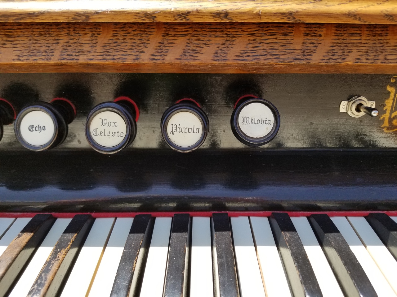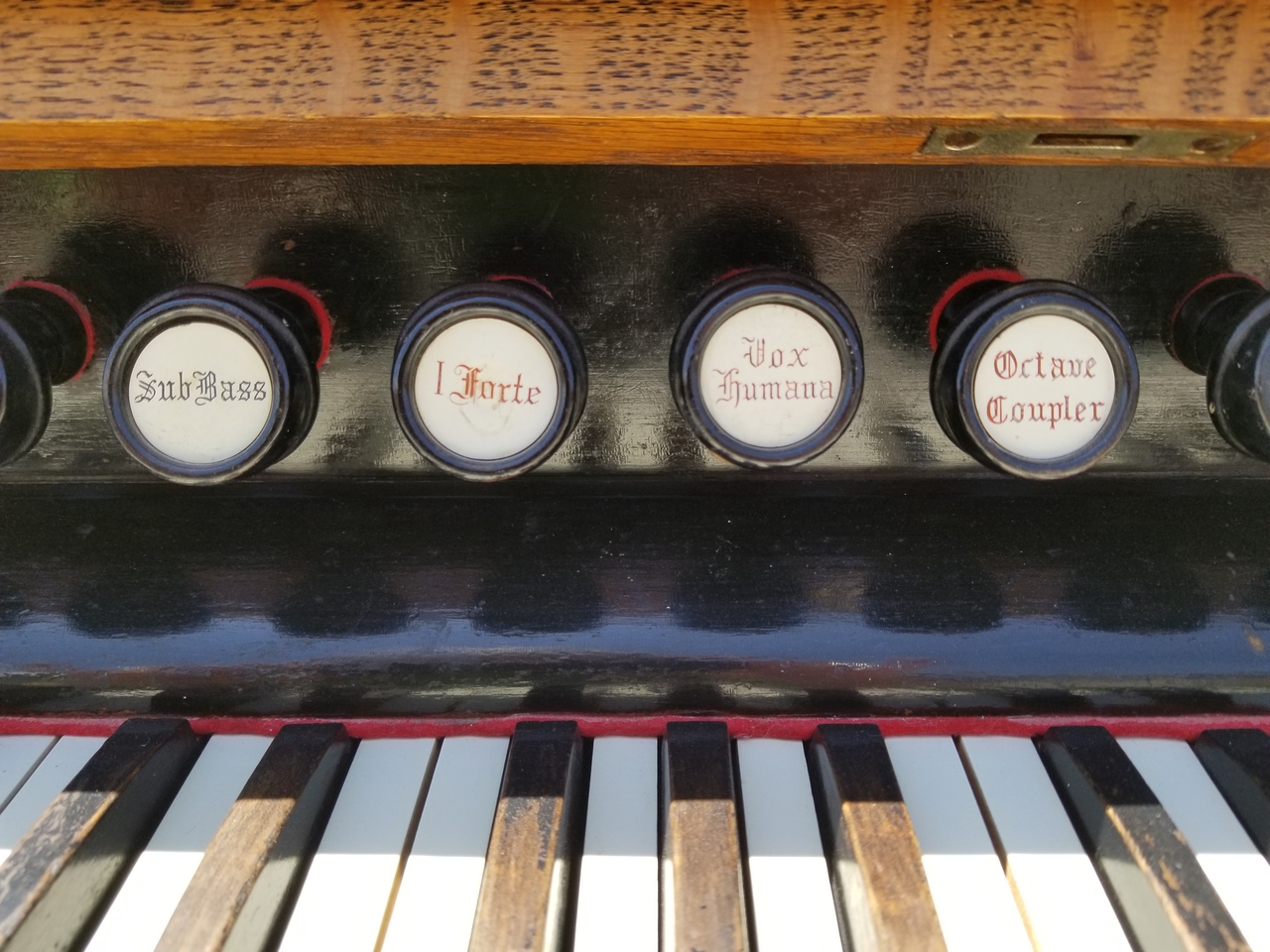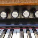 Left knee lever for Full Organ (without Vox Celeste/Gamba). Right knee lever for Swell.