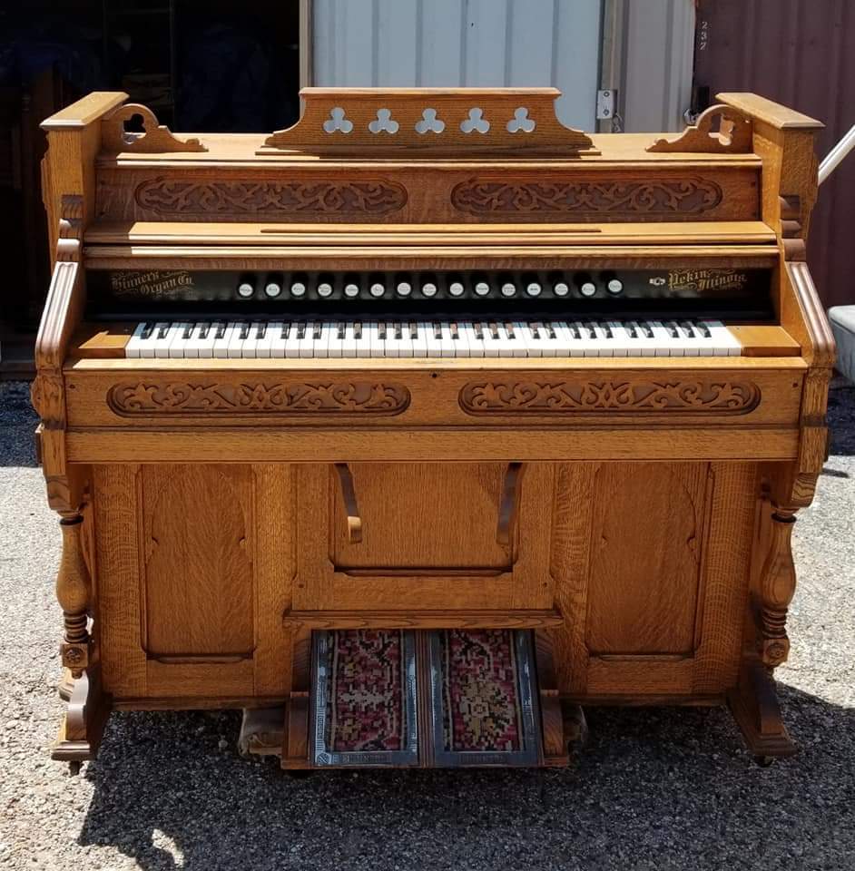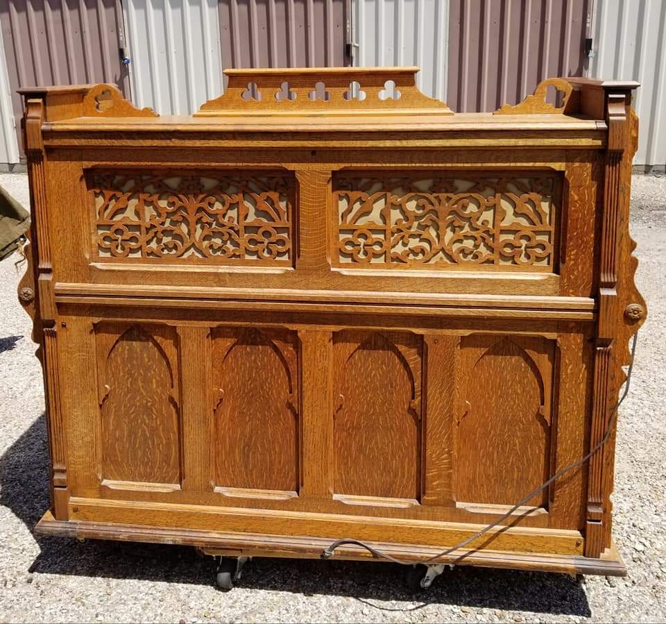 Finished back with fretwork. A lid on top back can be raised for more sound.