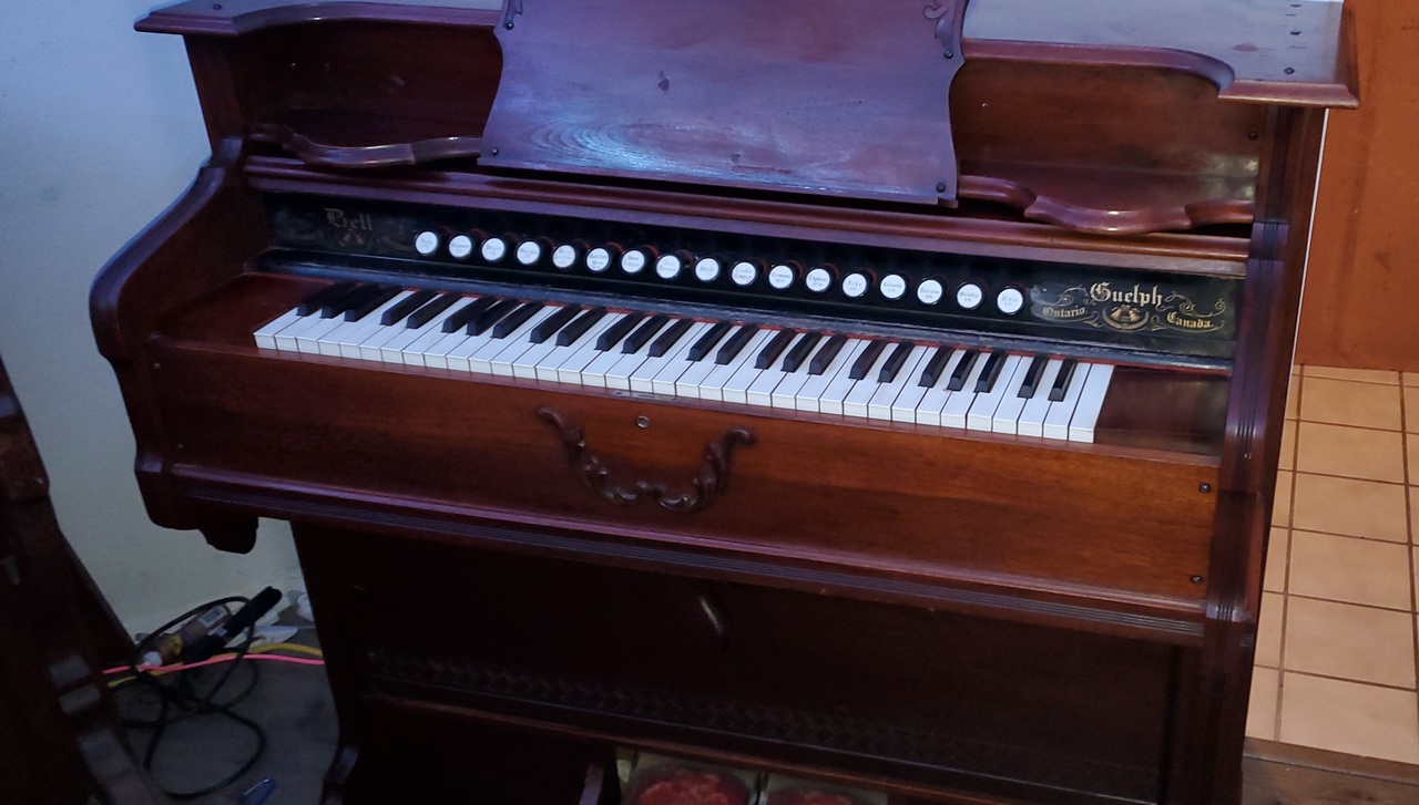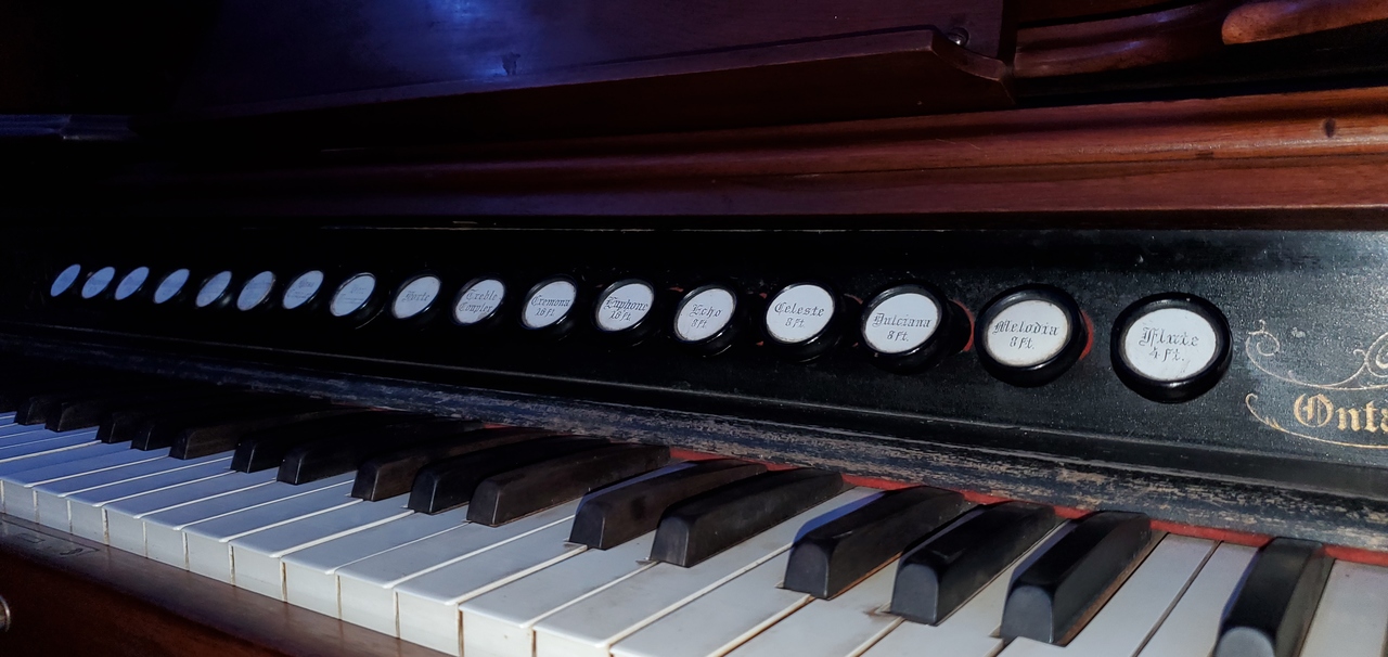 Organ in good working condition, all 272 reeds cleaned by me. High F# and Bb reeds broken in the Flute 4ft stop. Huge crack in the soundboard, which was sealed with duct tape, and holds vacuum.