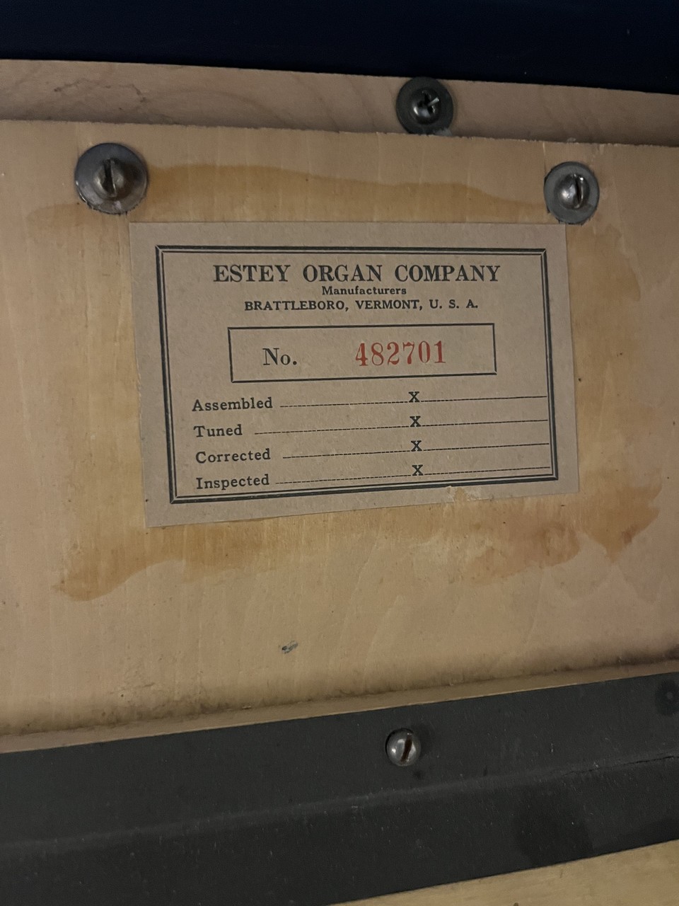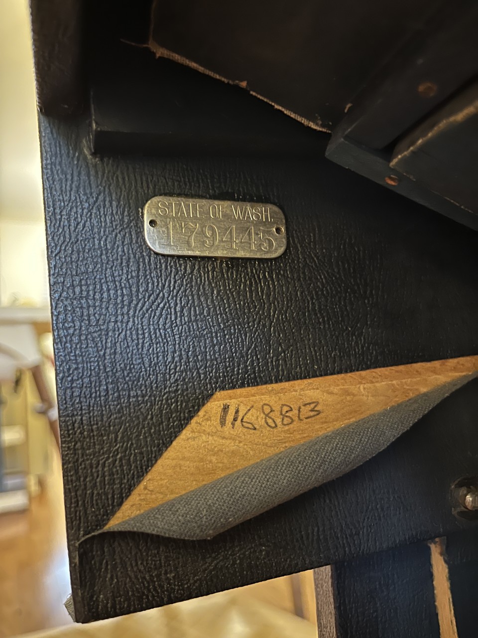 Metal tag riveted to underside of bass keyboard support: "State of Wash. // 179445"