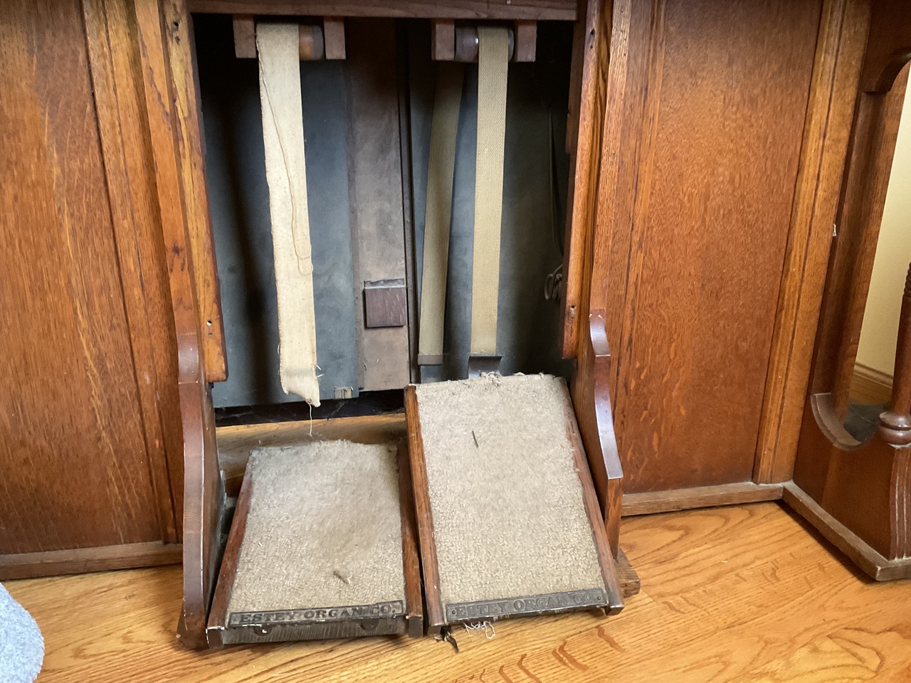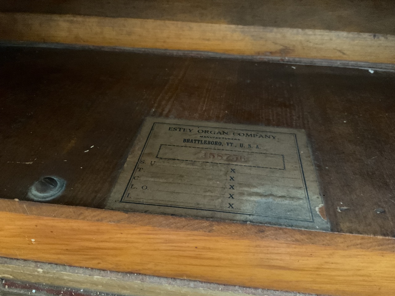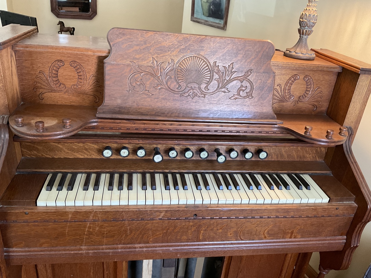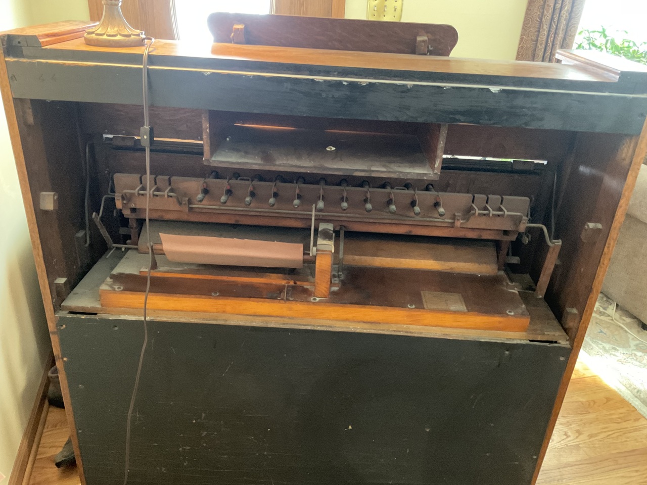 My Dad bought my organ for $25.00 in 1961. He then removed the black paint , stained the wood and did some repairs. The pull knobs did not have labels so he adhered some sticky paper in those spots. He replaced the carpet on the foot pedals. I took piano lessons on the organ for many years and still play it today. It has a beautiful sound.