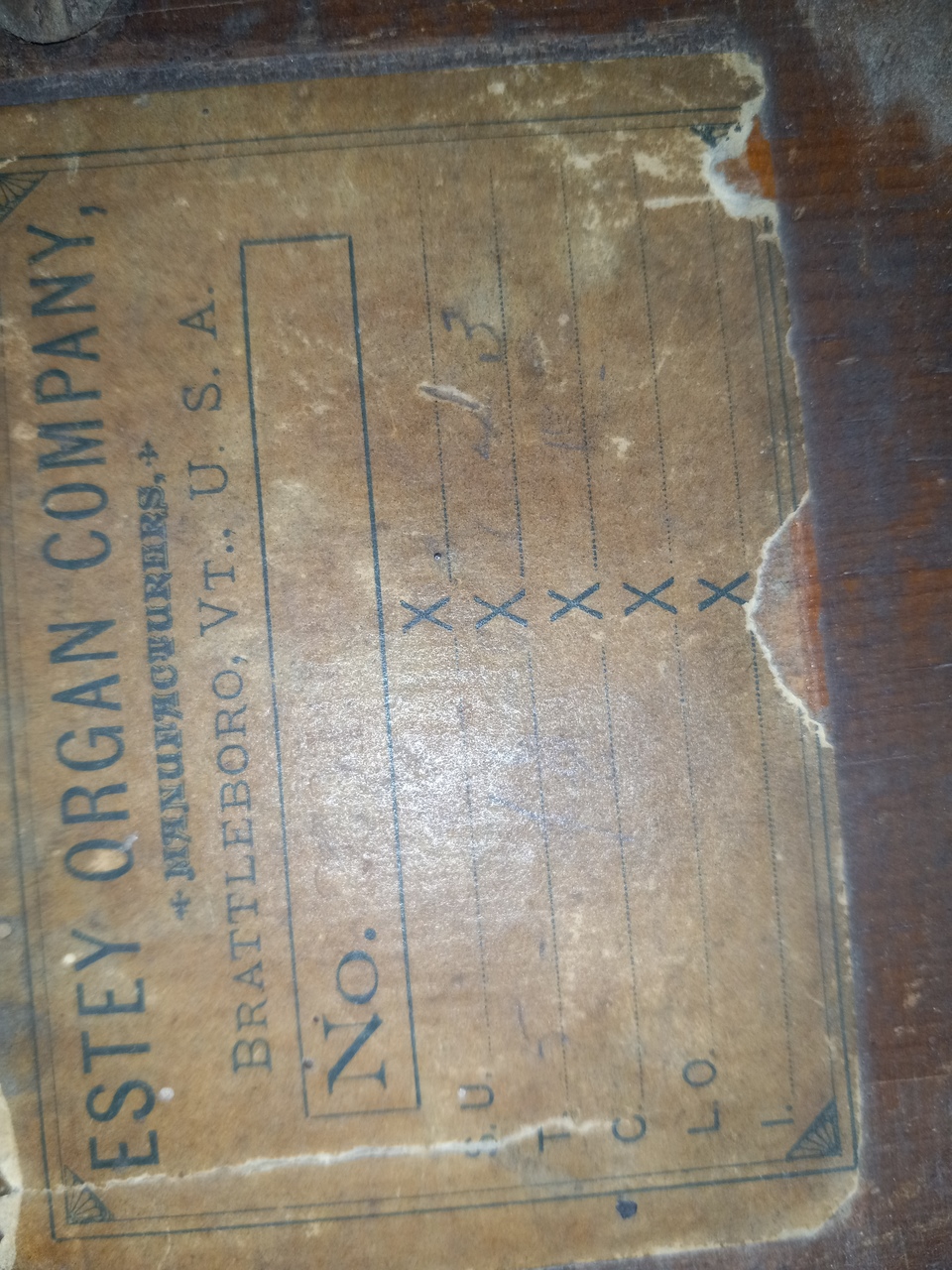 Serial number possibly 2531? (manufacturer's label is somewhat faded). 1892-1894 (per representative from the Estey Organ Museum.).