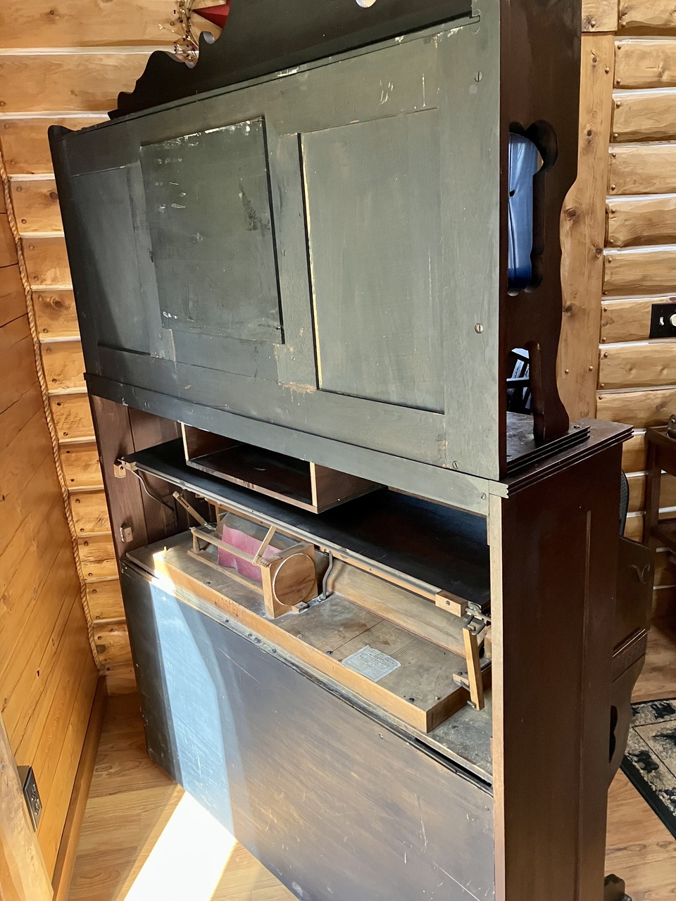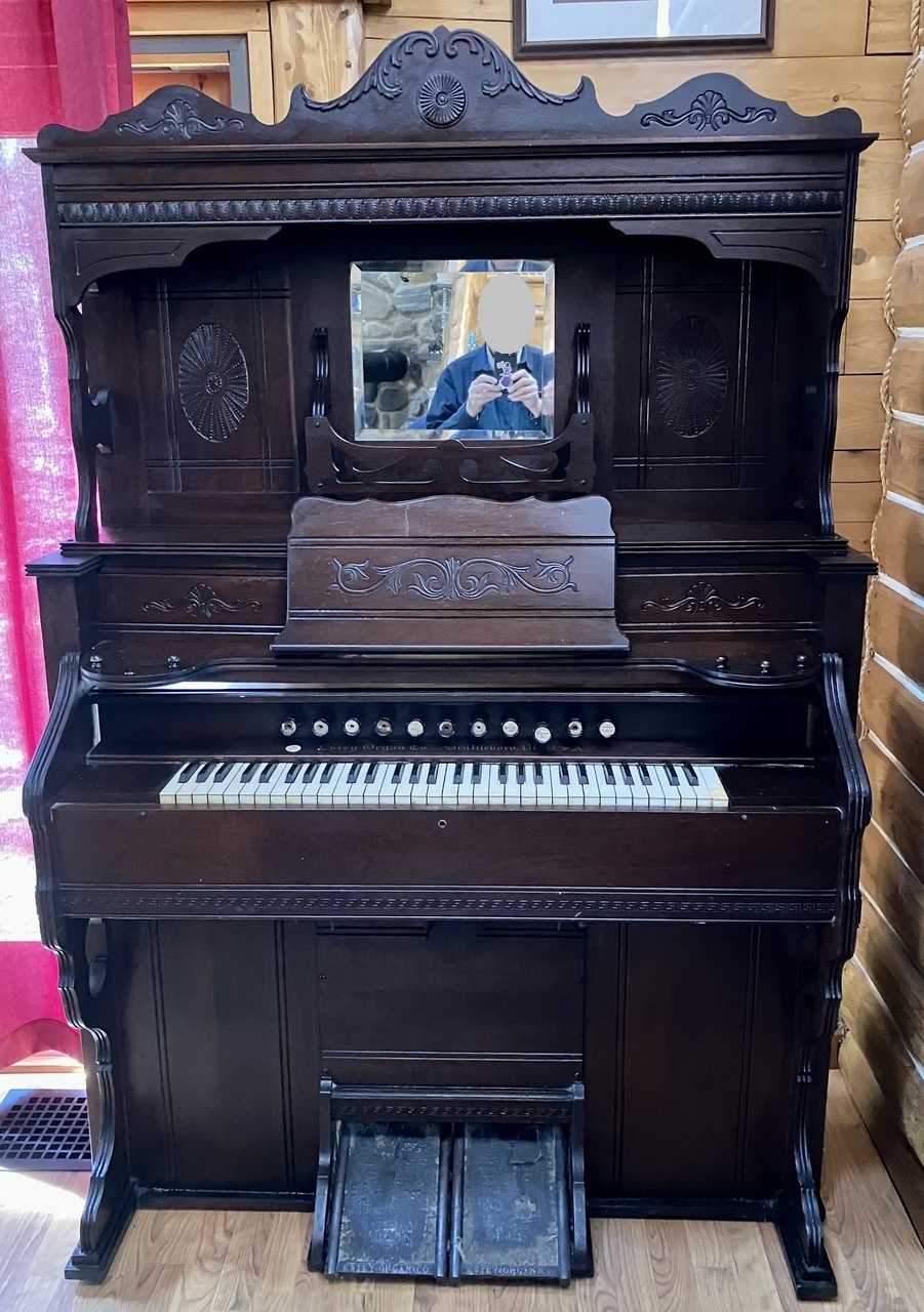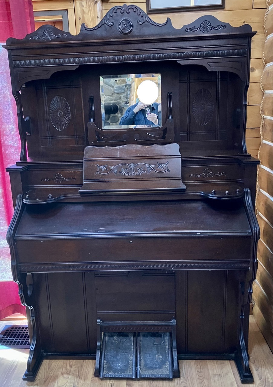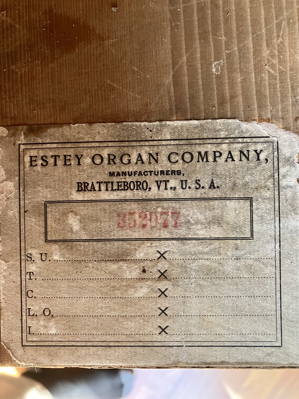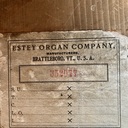 Stop names in brackets determined by (a) function; (b) comparison with Estey stop lists for model and period. Treadles with walnut sides, cast iron heel guard with "Estey Organ Co." on each; "?" toe guards; 7 3/4 X 10 5/8".