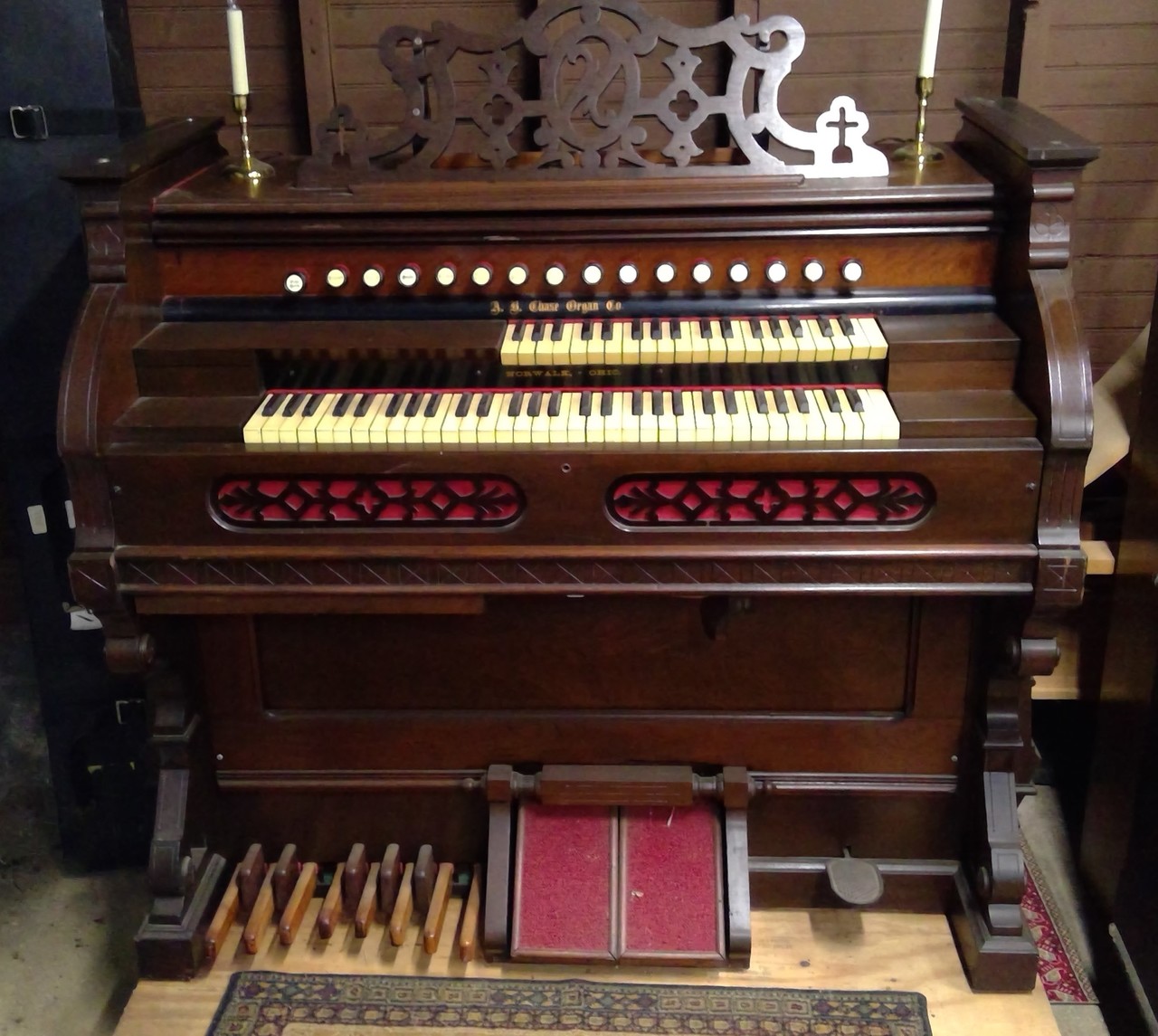 13 Pedal Keys pull down lower manual keys 8-20. Right knee lever for Swell. Locking pedal for Full Organ. Music desk is not original. This organ was acquired from the estate of ROS founding member Lynn Ware.