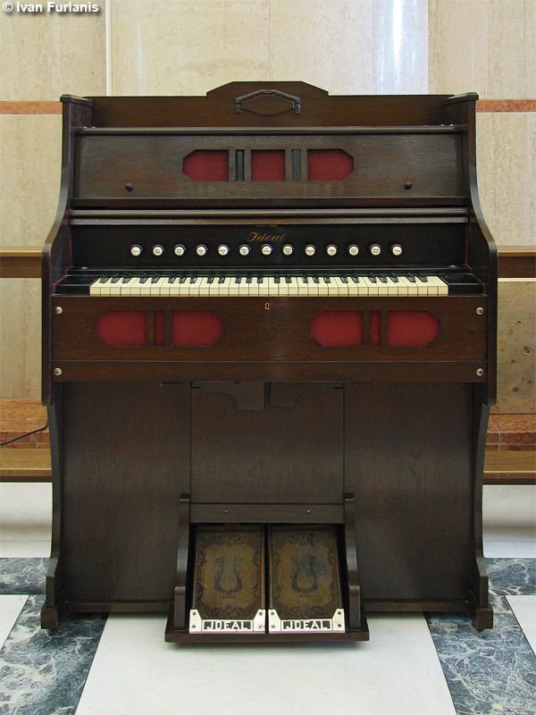 Located at Tempio del Sacro Cuore, Padova, Italy. Although Schiedmayer in Germany made an Ideal organ, best educated guesses is this organ was made by the Beeston Organ Works a subsidiary of J.W. Sawyer. It was quite common to have spelling errors in fancy lettering.